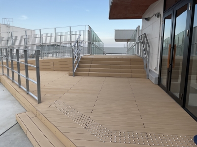 | 概要 | 複合商業施設内屋上デッキに施工された「アイン・スーパーウッド」。明るさと温もりを感じるホワイトオークカラーが採用されています。 |