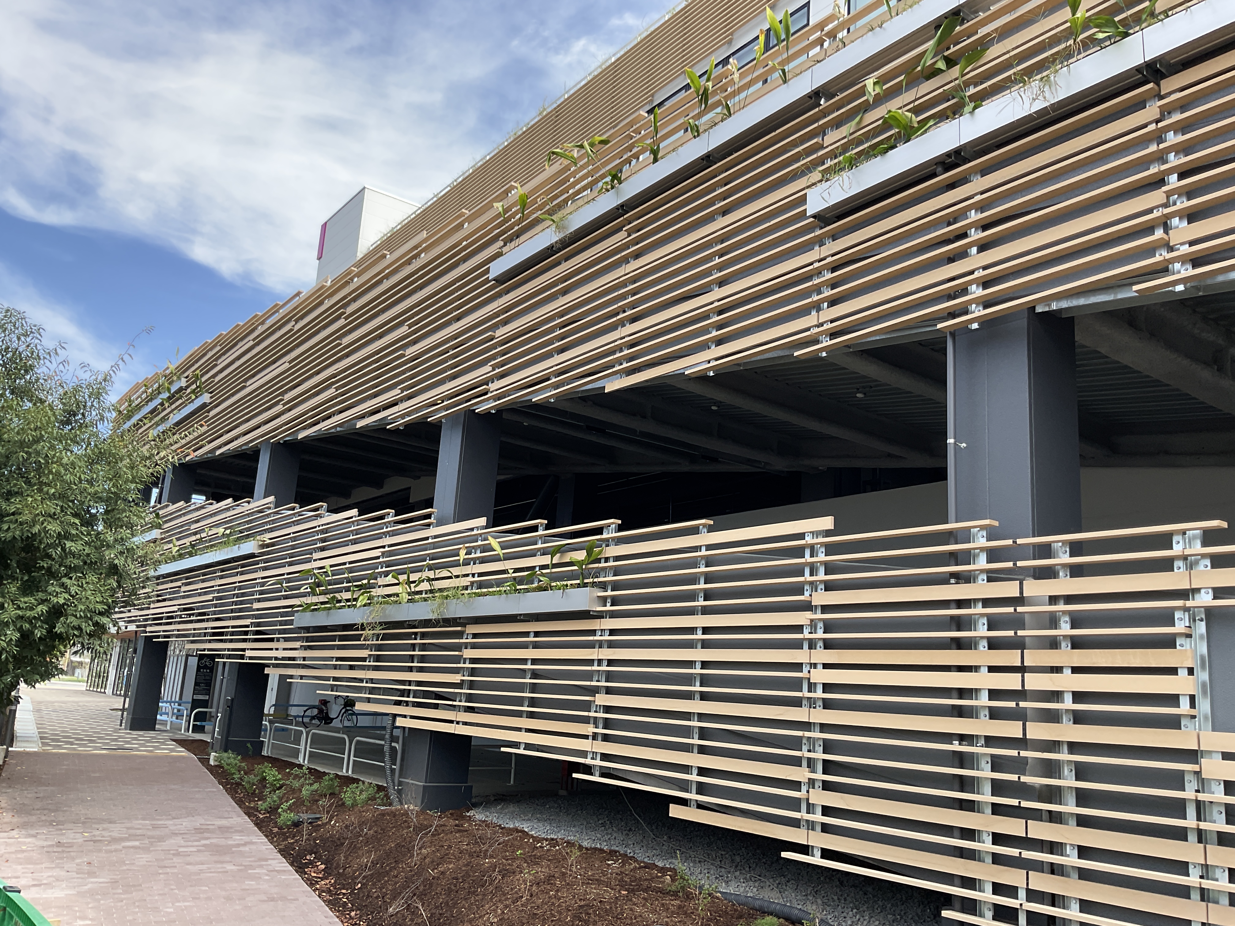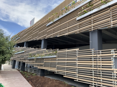 | 概要 | 複合商業施設屋内駐車場のスロープ外壁に「アイン・スーパーウッドα」のアルミハイブリッドルーバーが採用されています。 |